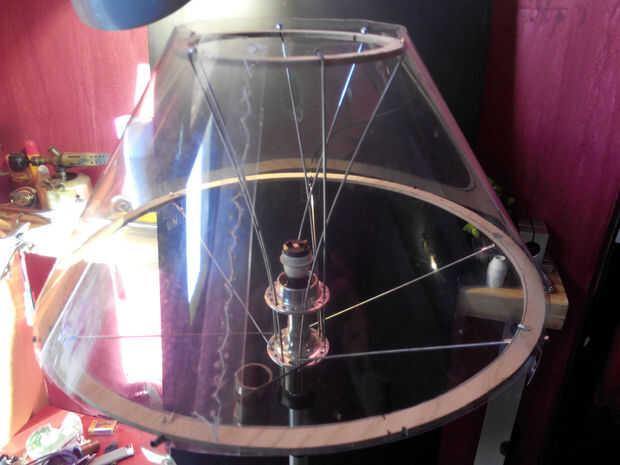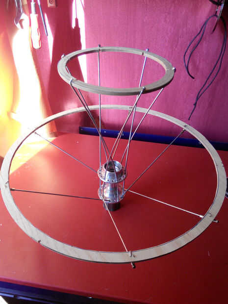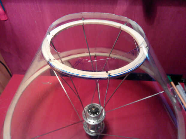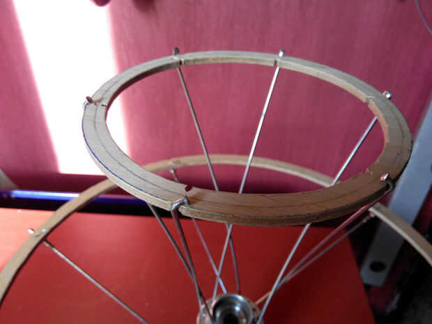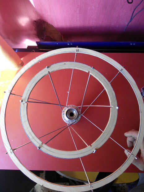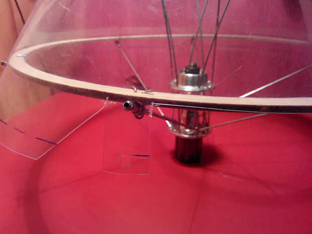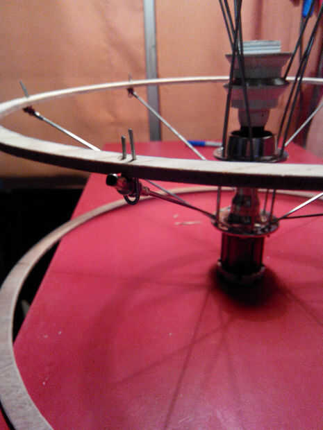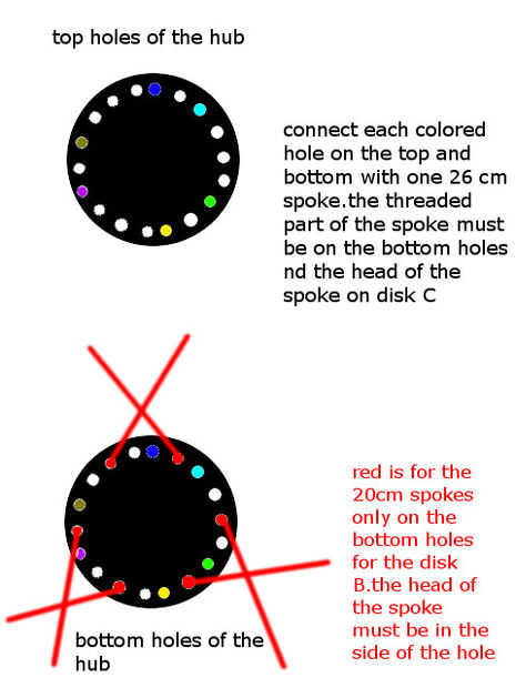 El disco C permanece allí debido a la presión de los radios (los colores del dibujo). Después de asegurar a ambos de los discos puedes probar no balanceada rotación y si es necesario bellas sintonizar los radios. Sintonizar el disco C moviendo los radios un poco hacia arriba o hacia abajo y el y el disco B es como un centrado de rueda de bicicleta.