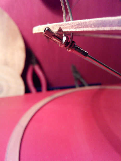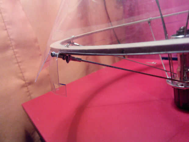 Una vez usted corta el trazado de la hoja de acrílico coloque encima de los discos para ver si cabe y conecte los lados con cinta invisible (también coser con una aguja y un hilo de rosca). Asegúrese de que cabe bien en los discos y su tiempo para asegurar la hoja en el disco B (no es necesario para asegurar en la parte superior). Cortar el exceso de la parte superior e inferior, pero en la parte inferior cortar una forma como la de las fotos que el habló del gancho y quedarse allí. También de esta manera se puede quitar muy fácil si te gusta, solo lo desenganche de los radios.