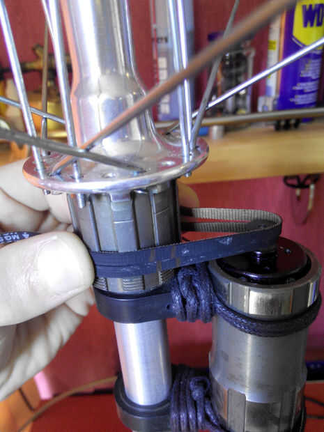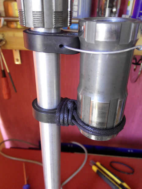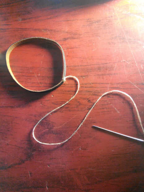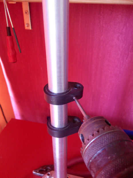 Perfore un agujero en cada uno de los soportes de plástico que se encuentran en el tubo de aluminio. Luego use un par de alicates y un alambre doblado para tirar un pedazo de cuerda por los agujeros. Con el cable sujetado alrededor de la carcasa lo único del motor izquierda es alimentar el motor y la posición de la correa de distribución. Determinar la distancia entre la polea del motor y el eje y corte un trozo de una correa dentada (mina viene de una impresora antigua). El coser que laterales de la banda junto con una aguja y un hilo de rosca pero cuidado que usted necesita para mantener la correa en el tubo o si no tienes que desmontar la base o en el cubo para conectar al motor.