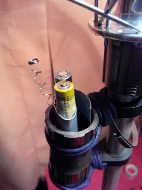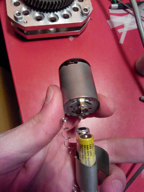 Para alimentar el motor utilicé dos AAA pilas beacause probado y gira el cubo a un rpm bastante aceptable. Una alternativa podría ser que un motor de pasos programados a diferentes rpm depenting la proyección necesitada para cada imagen en movimiento. Pero seguí tan simple como sea posible. Las baterías se conectan en serie con una pieza de metal y cinta. Luego aseguraron en otra placa metálica doblada para whities dentro de la parte inferior de la carcasa. También se utiliza un resorte que actúa como un interruptor de la prensa. Cuando el motor se presiona desde arriba comprime el resorte y los electrodos motor tocan los polos de las pilas. Al liberar la presión en el motor el resorte empuja el motor hacia arriba y se detiene. Si desea que el motor funcione sin presión puede mantener apretado con una goma. También pueden revertir la dirección que gira el motor girando el motor 180degrees en la vivienda.