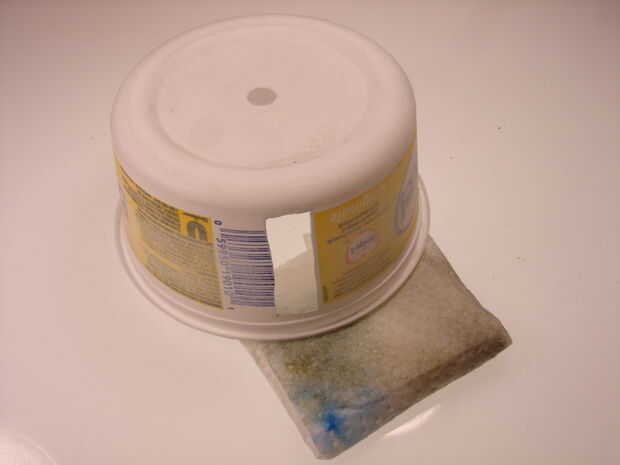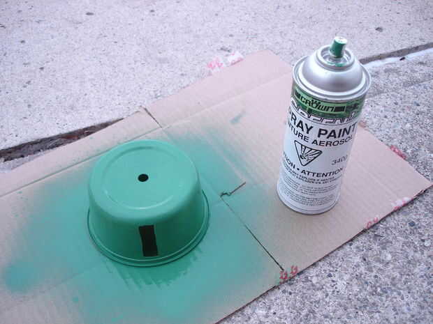 empecé lijando por el plástico. Después, limpie la superficie para eliminar el polvo. Luego, termine pintando la cosa verde primero por lo que podría tener las etiquetas en él. Eso verde es realmente oscuro y feo. Era la única pintura que tenía en stock.