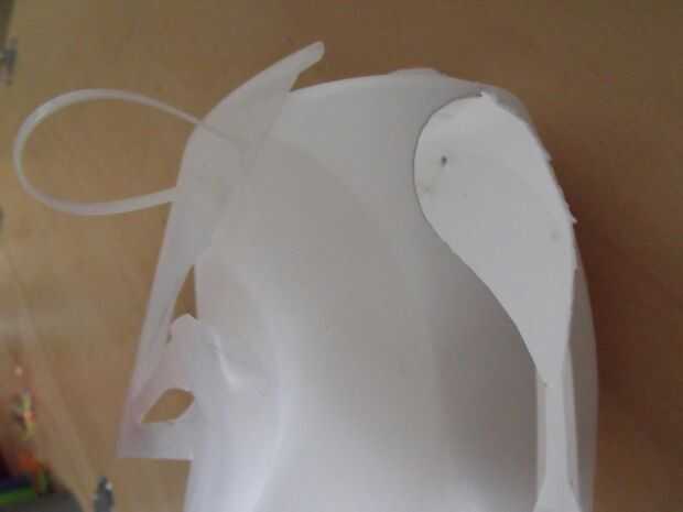 Las alas se unen con dos bridas en el cuerpo. Así que hacer agujero en los lugares correctos y el cintillo a través de la pisada. Los hombros deben pegarse un poco en la parte superior del cuerpo.