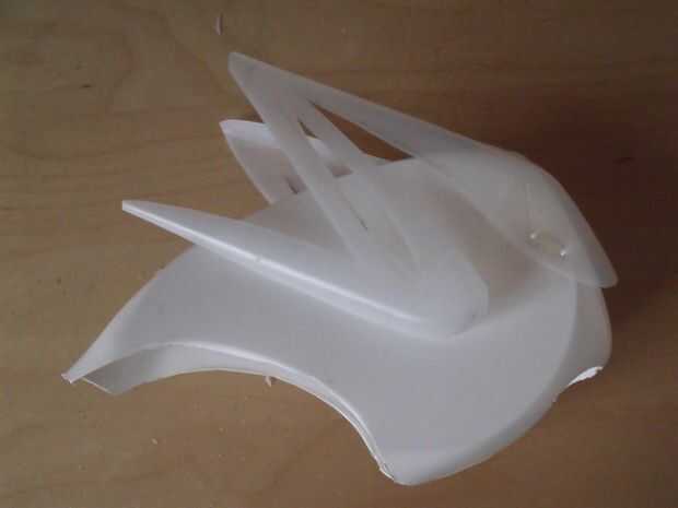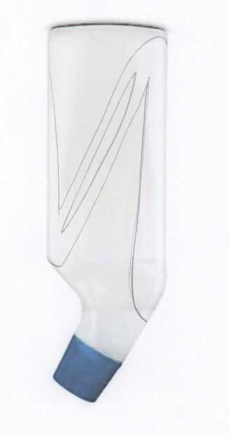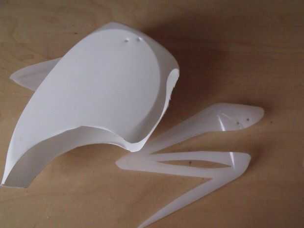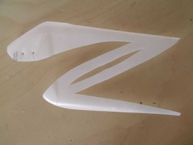 Las alas o los huesos del brazo se cortan de una botella de 1 litro de baño limpiador. Primero se corta la botella en dos partes a lo largo de la costura donde las partes plastica se sueldan con autógena juntos. Ahora debe tener idéntico (espejada) frente y parte posterior. Dibuja la figura con un lápiz o un marcador. Recorte con tijeras.