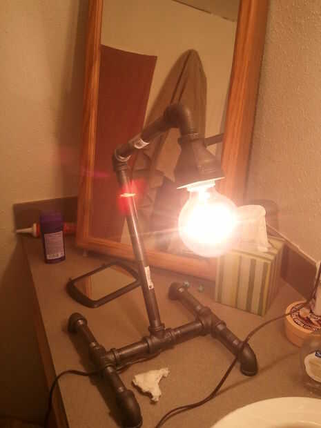 inspirado en muchos manuales en internet ahora trató de hacer una lámpara de tubos de plomería por mi cuenta. Estoy realmente satisfecho con el resultado. Es estable. el foco se fija correctamente en la cabeza y los brazos con imanes son útiles para
