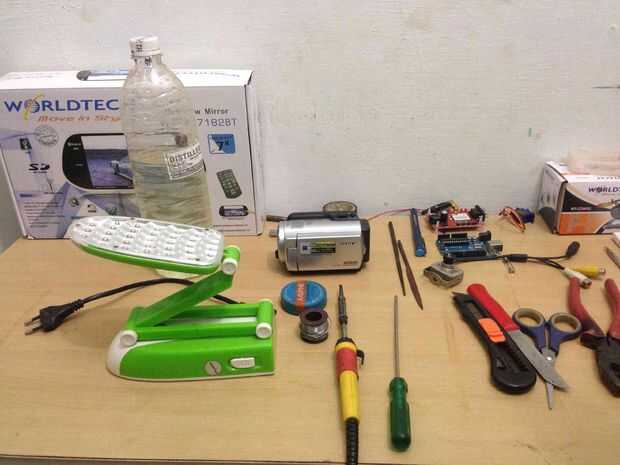 Esta lámpara de escritorio totalmente reciclado hace una declaración mediante la transformación de materiales desechados en algo útil, lo que es fácil de recrear esta lámpara sin gastar un centavo. Piezas de repuesto de lámparas y electrónica desecha