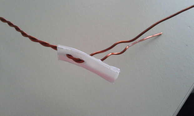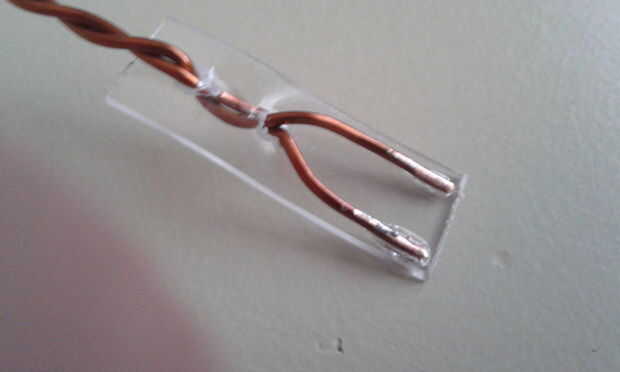 Mismo procedimiento que el último paso. Dos agujeros, alambres a través. Tira de 7mm del cable. Ahora tienes que colocar los dos cables a una distancia de 7mm, posiblemente centran en la pieza de plexiglás o cualquier plástico puede (tal vez de una botella de plástico).