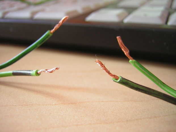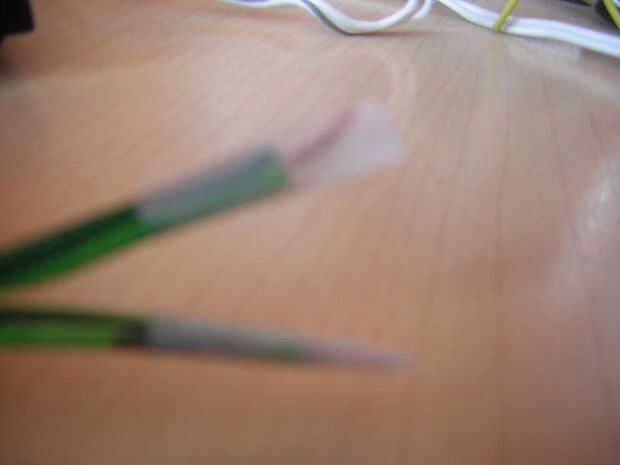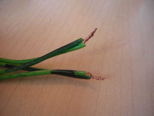 El último paso es volver a conectar los cables. Usando las pinzas, tira un poco de los extremos de los cables (que tenga que tirar aparte un poco). Ahora, tenga cuidado. Tienes que conectar los cables de la manera correcta (polaridad) o la lámpara no funcionará. Si observas con cuidado los cables, se dará cuenta de que un cable tiene puntos de escritura en él. Toque los cables de nuevo juntos con los dedos, asegurándose que tiene los cables con escritura conectados entre si y los cables pelados conectados a unos de otros.