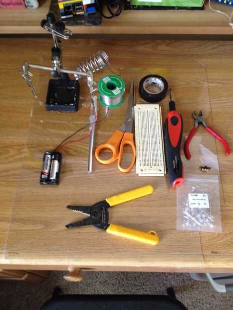 Primero debe obtener los materiales mostrados aquí, soldadura, Cautín de lápiz, sólido y alambre trenzado, luces LED, un tablero de pan para probar el circuito, aunque no es necesario, 2 pilas AA, un soporte de la batería 2 ranura AA, cortador de alambre / pelacables, cinta aislante, un interruptor, tijeras, Velcro, lija, pegamento caliente y algunas láminas de plástico, yo tengo la mía desde el pasillo de la manía.