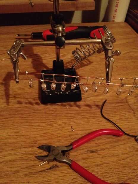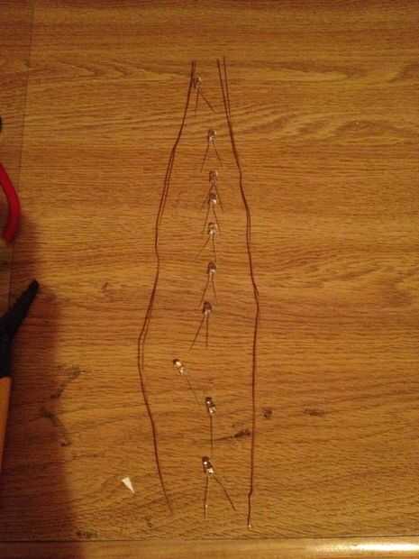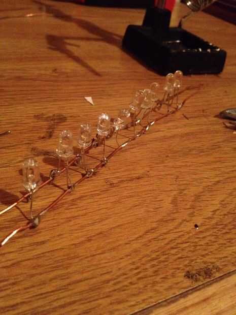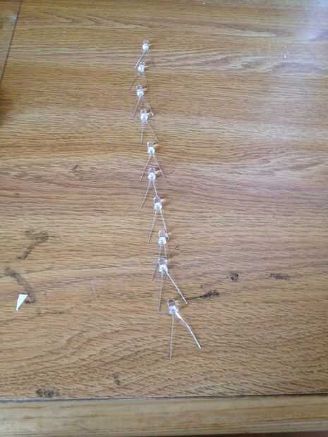Primero alineado el LED en una fila con los cables negativo a un lado y todos los cables positivos (debe ser de los lados más largos) en el otro.