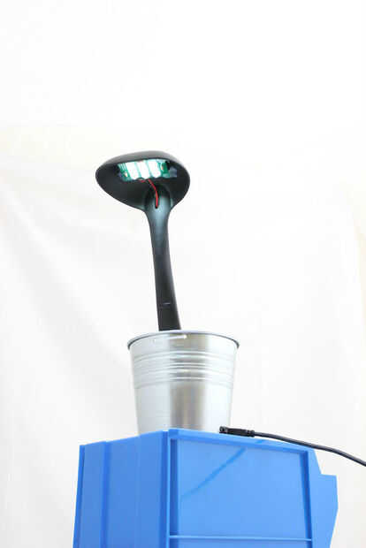 Esta lámpara de escritorio se hace de un £1,25 había galvanizado macetero "Socker" y un plástico de 40 p "Speciell" cucharón. Decidí usar la maceta para que la lámpara se doble como un ordenado de escritorio. Un láser de corte bloque de base o de madera con un agujero en él habría servido también para montar el cucharón en. Es la cuchara que realmente le da la forma de la "lámpara" a este proyecto.