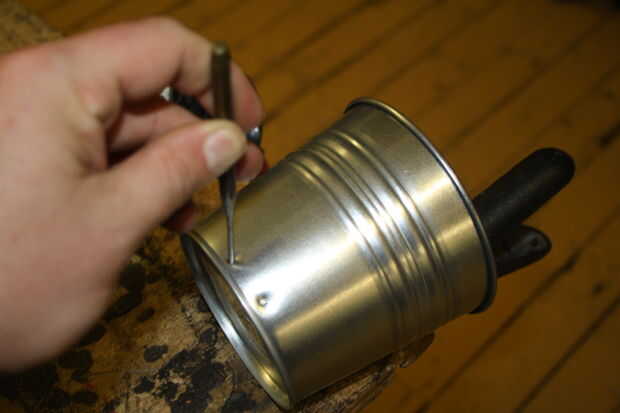 Para hacer la ranura en el macetero usé una herramienta de punzón y un martillo. Asegurándose de que el bote estaba fuertemente sujeta al Banco de trabajo utiliza la herramienta del punzón para marcar una fila de golpes cerca de la base de la maceta. Utilizar mi herramienta multiusos Dremel taladré una fila de agujeros estrecha a lo largo de la longitud de la fila dejando una abertura irregular como agujero. Al hacer la ranura para asegurarse de que esté lo suficientemente alto como para el lado de la maceta que cuando se coloca la placa de arranque USB tiene espacio suficiente para encajar el cable Micro USB en la ranura.