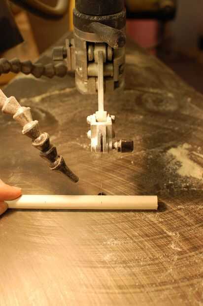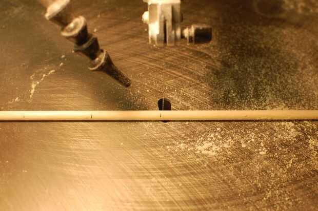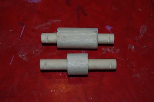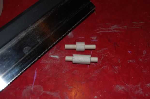 Dos de los taquetes de 1/4" necesita un poco muesca cortada en sus extremos para evitar que los resortes resbale. Con la Sierra de calar o una pequeña mano de sierra, corte muescas en los extremos de las espigas en la foto, aproximadamente 1/4" del extremo.
