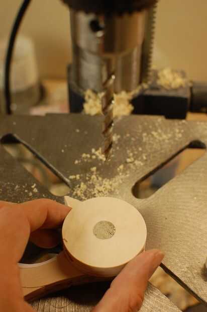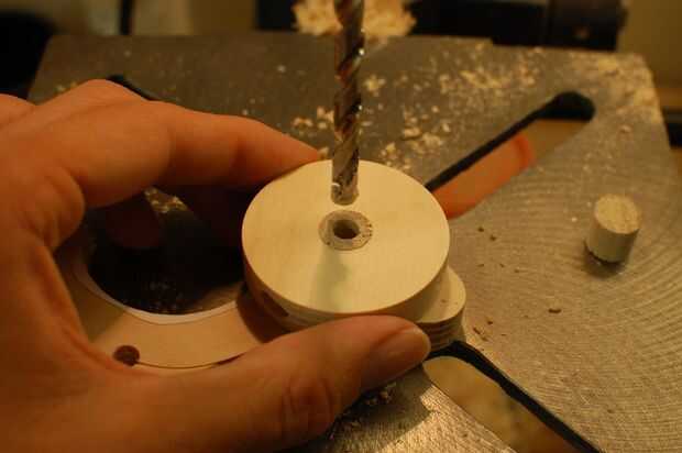 Ahora, un poco de un paso complicado. Taladre un orificio de 1/2" en un pedazo de madera de desecho. Insertar cada uno de lo 0.5", 1/2" diámetro largo piezas en el agujero y perfore un orificio de 1/4" recto a través del centro. La pieza de chatarra ayuda a mantener el pasador corto y paralelo a la broca. Hacer lo mismo con la espiga 1" largo 1/2".