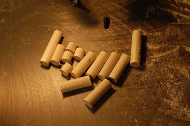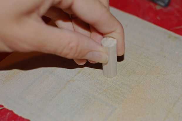 Los extremos de cada espiga para eliminar cualquier rebaba y aspereza de la arena. No la arena en todos los lados, o los tacos se ajusta demasiado floja! Dependiendo del grosor de la madera contrachapada de abedul Báltico, estos tacos pueden ser hasta 1/16" de demasiado tiempo - simplemente arena o cortar al ras como sea necesario durante la etapa de montaje.