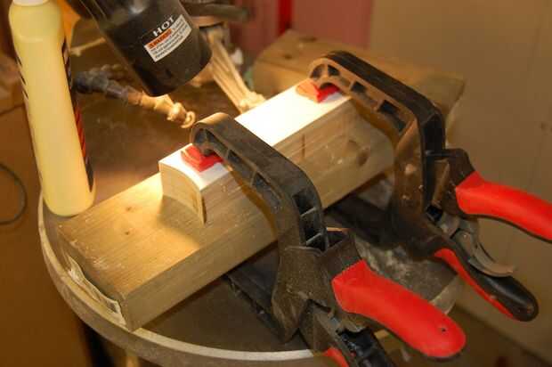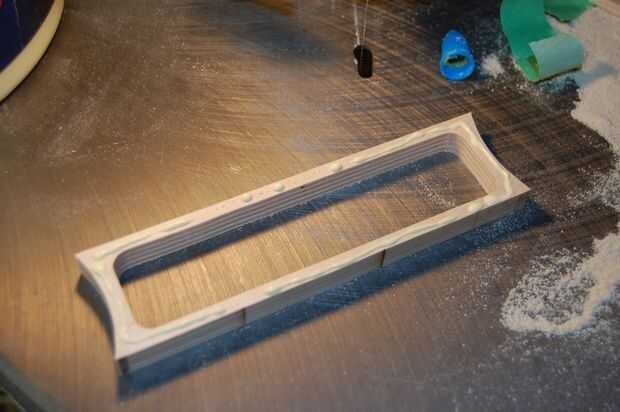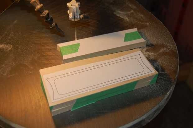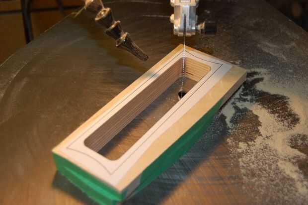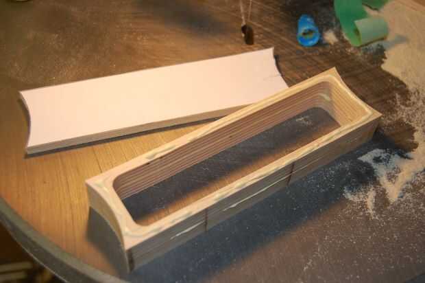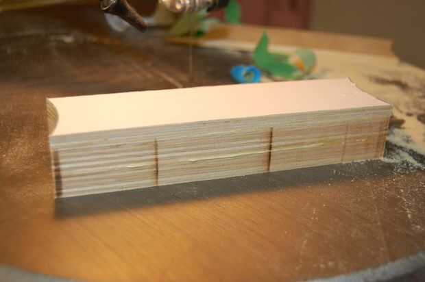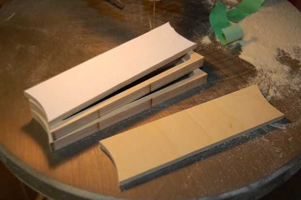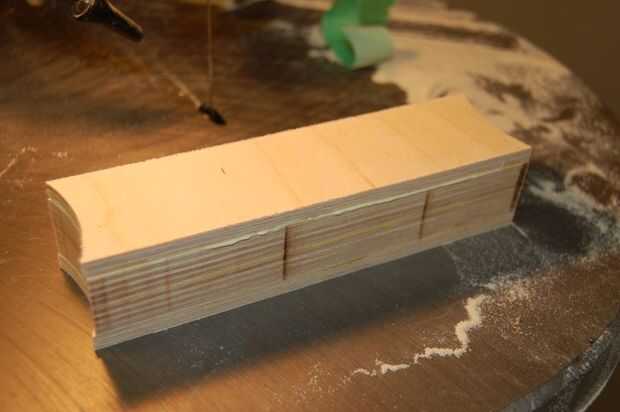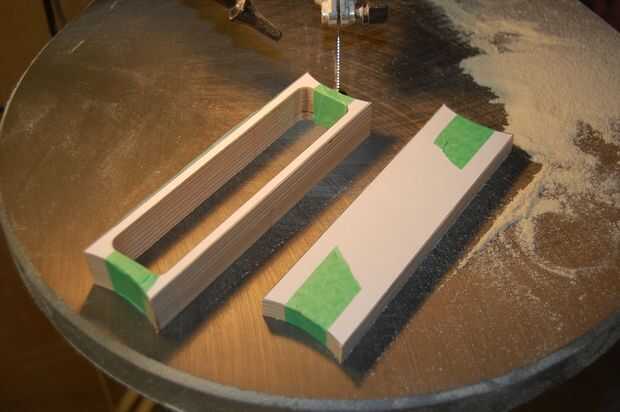 Incluidas en los diseños es una pequeña caja que se puede montar, con algo pesado y atado debajo de la base que lo mantenga agobiado. La caja se hace de cuatro capas, dos de madera de 1/2" y dos de 1/4". Cuando se apilan juntos, la caja es un poco más corta que los "dedos" en la base, y así se desliza discretamente por debajo. Cortar las piezas por el amontonamiento, como con las otras piezas, luego unir la parte inferior y los lados. De la abrazadera hasta que se seque. No hay necesidad de arena suave todavía...
