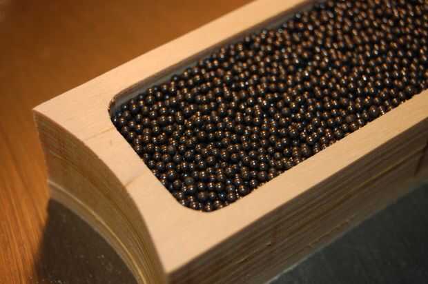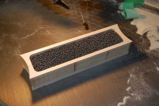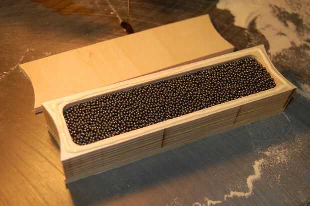 Llene la caja con algo pesado. Compré una bolsa de plomo fino tiro siglos atrás, que uso exclusivamente para el llenado de contrapesos como esta. Mucho más noble causa que matar a pequeños animales, OMI. Cuando se llena la caja debe pesar casi dos libras. Pegamento en la tapa una vez la caja está llena.