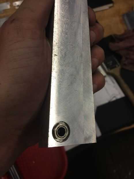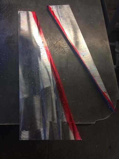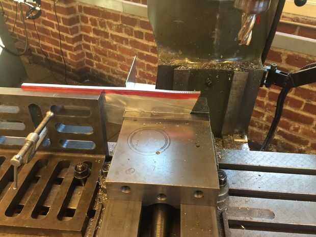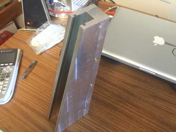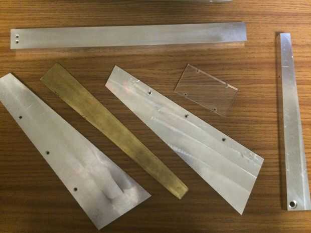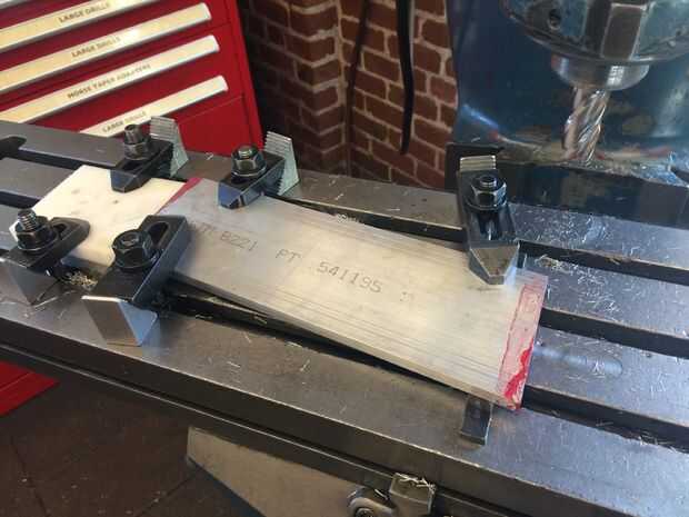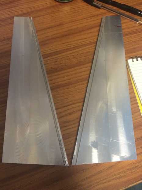 La base consiste en dos hojas de aluminio de 3/8" y una pared con agujeros roscados a unirse a ellos. Utilizando un molino y una correa de abrazaderas, accesorio tus piezas de aluminio abajo en un ángulo de 7 grados y los lados superior e inferior paralelos del molino. Luego, una vez hecho esto a ambas piezas, voltearlas y trazar una línea aproximada a 17 grados para el corte en el otro lado. Corte esta línea con una sierra de banda y luego proceder al molino hasta forma. Cuando haya completado este último ángulo de fresado, obtener una 1/8" herramienta de ranurado y corte una ranura en una profundidad de 1/8" por debajo de este último ángulo. Hacer este mismo paso para el otro lado, pero asegúrese de cortar en el lado opuesto de modo que ambas ranuras enfrentarán.
