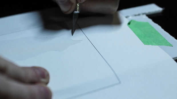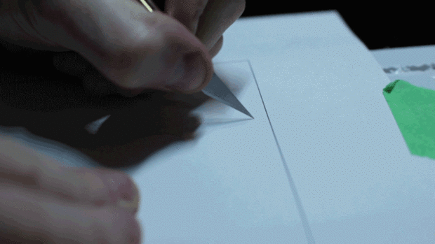 Cada una de las capas de la foto a imprimir y en el centro en el acrílico. Corte con cuidado alrededor de la plantilla siguiendo el esquema. Estará cortando a través del papel en la capa protectora de acrílico. Se trata de cómo se hacen las plantillas!