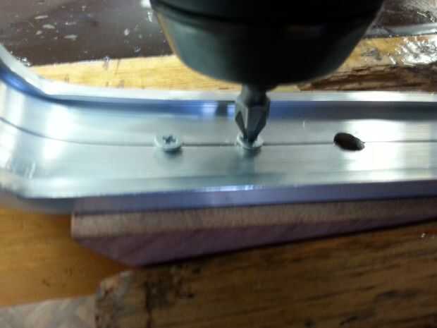 Después de eso coloca mi tira de aluminio por lo que el centro de mi base es dejar espacio igual en cada lado. cuando coloca le pedí a un amigo para mantener el aluminio en posición mientras usé un destornillador para introducir los tornillos en.