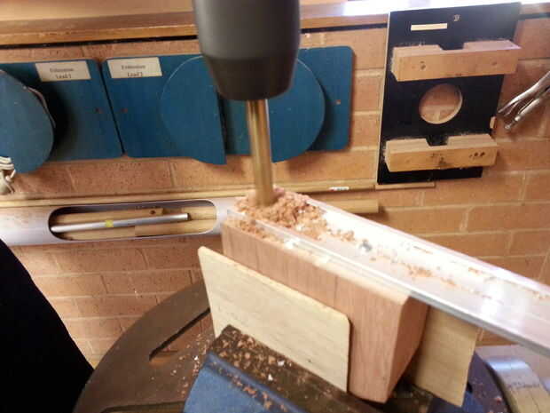 Usé un taladro para perforar un agujero a través de mi base y mi aluminio. Usé un tornillo de banco portátil para mantener la base y una broca de taladro que haría un agujero considerable sub para el cable pasar. Este agujero fue totalmente a través de la base.