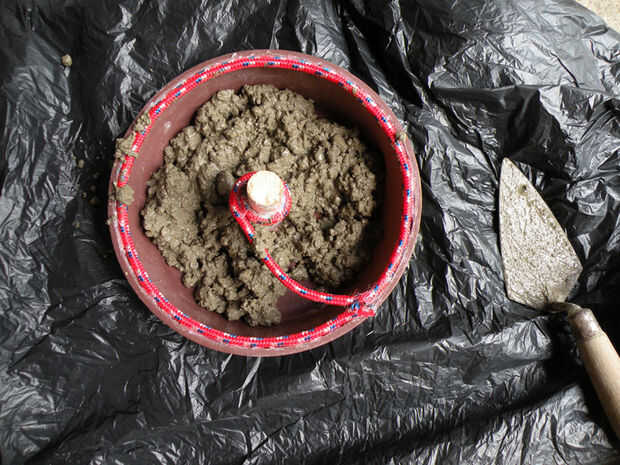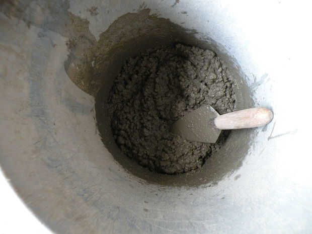 Paquete en el molde, presionar abajo bien y picar o hurgando con la llana para forzar las burbujas hacia fuera. Apretando los lados del tazón de fuente también ayudará. Llana lisa superior. Dejar curar durante al menos veinticuatro horas.