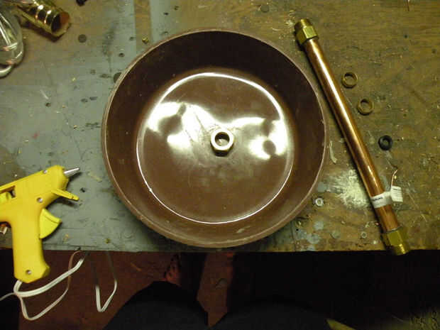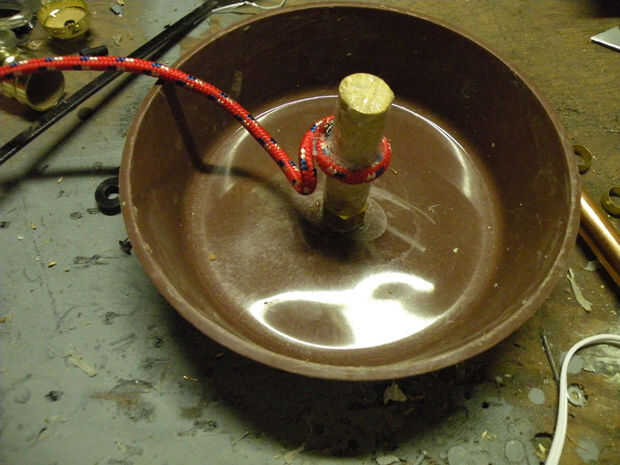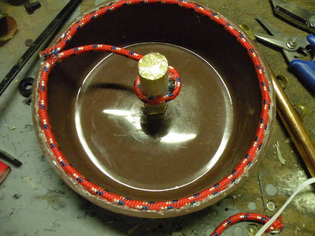 Para hacer un poco revelan alrededor de la base, así como un camino ahuecado para que el cable pase, pegamento algunos cuerda el perímetro del labio del recipiente, con una coleta poco corriente en y alrededor del centro de correos como se muestra. Puede utilizar cualquier número de cosas para hacer la revelación, burletes, espuma de poliestireno o aislamiento de la pipa.