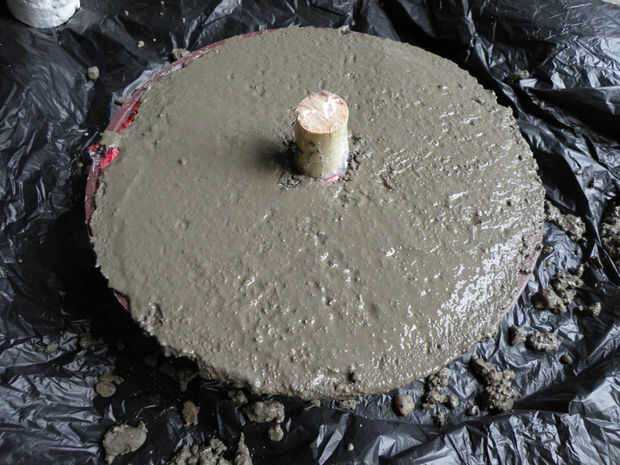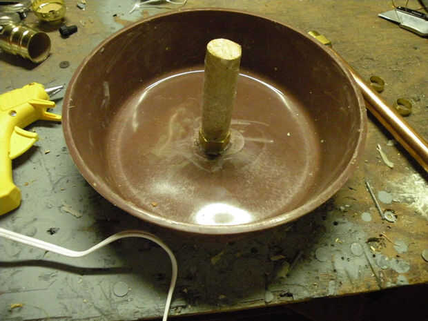 Tomar una tuerca y pegamento abajo en el centro de la taza con pegamento o sellador de silicona. Añadir un trozo de espiga o de pie, pegado a la tuerca de la pipa. Si se utiliza un pasador de madera, envuélvalo en cinta de embalaje primero--de lo contrario absorberá humedad y cemento, ampliar y muy difícil salir de una vez las curaciones concretas.
