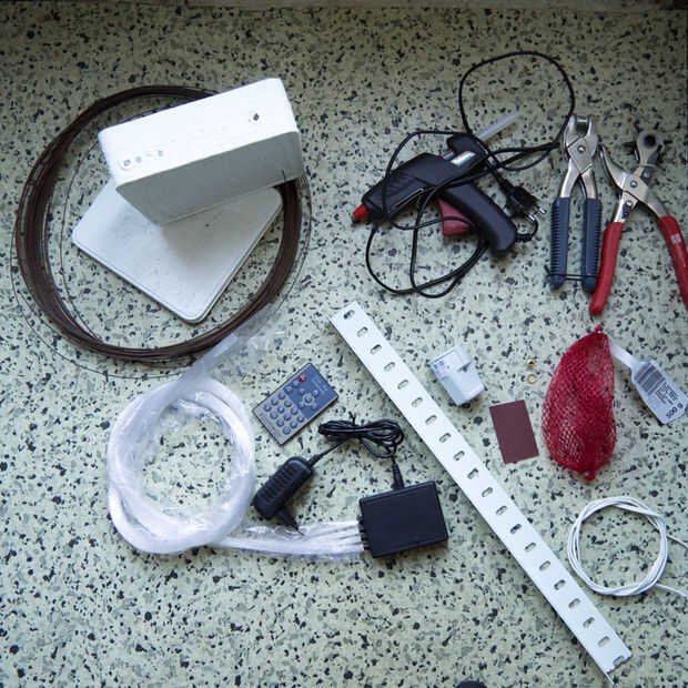a la caja para sostener la electrónica (utilicé una caja de praliné) y una manera para hacer agujeros en la caja (depende del material de la caja). Creo que es genial cuando tiene una tapa, para facilitar el montaje y poner el control remoto en alguna parte. Mejor utilice una caja de incombustible