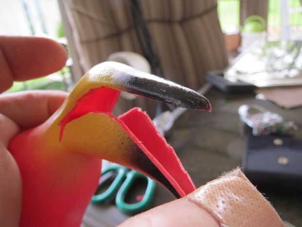 Dividir el pico donde está la cumbrera, con una navaja. También deben cortar un poco abajo del borde de la boca para dejar el pico abierto más amplio.