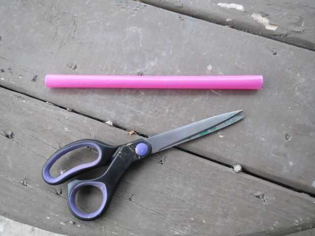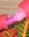 Para cubrir, me corte una raja abajo una paja batido rosa gruesa y cortar los anillos. Coloque unos sobre el cuello blanco. Pintar la pieza de cabeza de lámpara expuesta con pintura acrílica rosa.