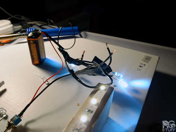 Debido a este conseguir destacados unsuspectedly debo añadir que no debe cable el LED a una pila de 9V sin resistencias. En mi caso de LEDs blancos tendría una resistencia de 270 ohmios para cada uno de los LED. La franja tiene su propio construido en, por lo tanto no hay necesidad de ello. Este instructable puede ayudarle a encontrar las resistencias necesarias para tu LED y comprender los conceptos básicos. Era una Virgen en electrónica cuando escribí esto así que perdón por mí