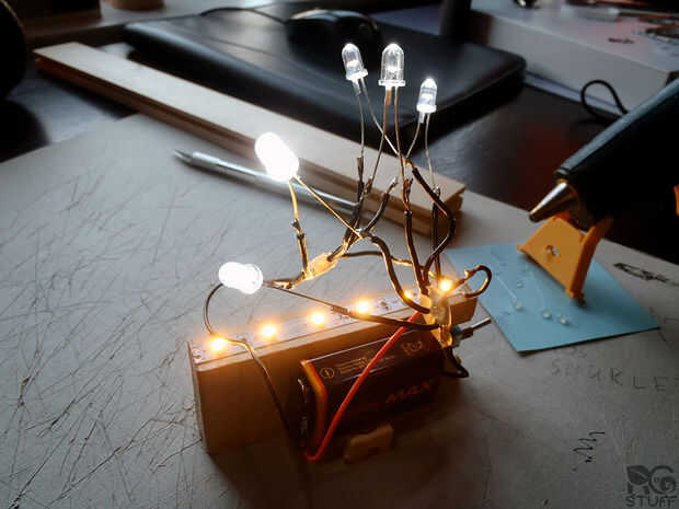 Decidí conectar los LEDs en paralelo después de mirar las ecuaciones para circuitos de serie y paralelo. Entonces decidió poner a prueba si decidí bien la vez anterior, utilizando alguna cinta aislante que me enganchado 3 LEDs y una tira de LED a la batería, dado vuelta le en y voila!