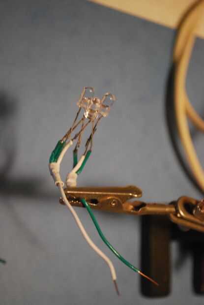 Experimentar con diferentes componentes para conseguir el efecto que te gusta. La foto muestra los tres que LEDs conectan en paralelo. Más se aíslan LED conductores para evitar cortocircuitos. Conductores de alimentación se quedaron el tiempo suficiente para ejecutar fuera de la bombilla y la batería.