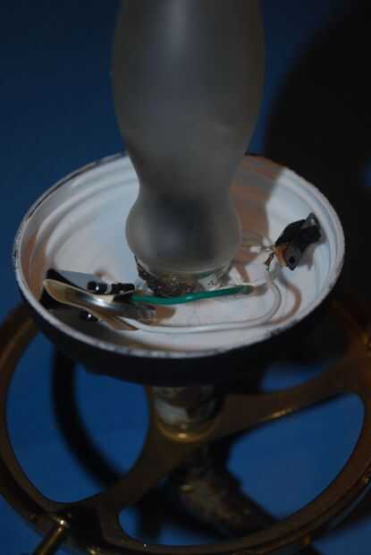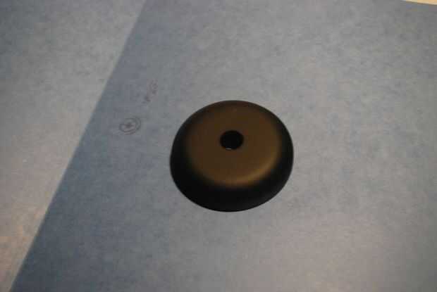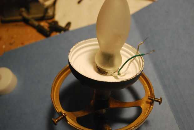 Afortunadamente, la apertura en la base de la bombilla fue lo suficientemente amplia como para dar cabida a la tobera de gas diámetro 1/2 pulgadas con espacio de sobra para los cables. Para ocultar los cables, cortar 1/2 en diámetro bodega en una tapadera que tenía sentados y pintada de negro. Esto sirve como base para la "llama" y se encuentra muy por encima del sujetador de la cortina, por lo que no es muy visible una vez que la sombra está en el accesorio.