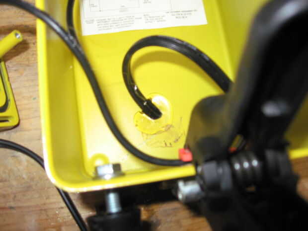 La última parte del cableado es para asegurarse de que se queda puesto. He logrado esto con abundante pegamento. Me puso unas pocas pulgadas de holgura en el cable de alimentación y luego lo sujeta a la caja. Con eso hecho apreté pegamento caliente alrededor de la médula donde entró en la parte posterior del medidor. Cuando haya enfriado ese pegamento pegué la holgura en la parte inferior de la caja así.