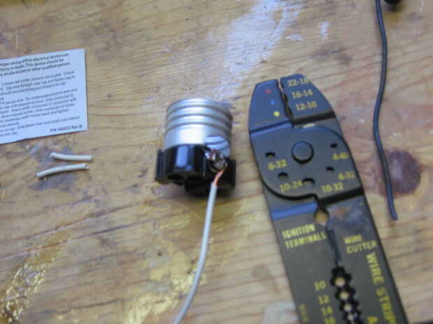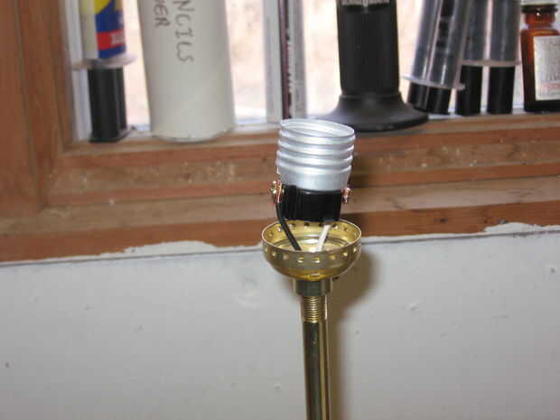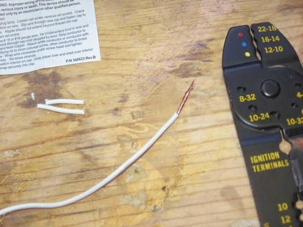El primer paso es cortar dos trozos de alambre de aproximadamente 12 pulgadas de largo que va desde la toma de corriente en la lámpara (usé blanco y negro) y los extremos de la tira. Con Coloque estas piezas de alambre a la toma. El cable neutro (blanco en mi caso) se fija bajo el tornillo color plateado en el zócalo. El hilo caliente (negro en mi caso) se fija debajo del tornillo de latón.
