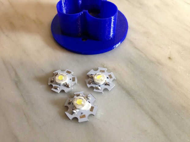 Si está conectando su propio LED para el disipador de calor, puede utilizar pasta de montaje en superficie y un horno de reflujo. También usé algunos compuesto adhesivo térmico para conectar el LED a la estrella y luego soldar los cables a los cojines.