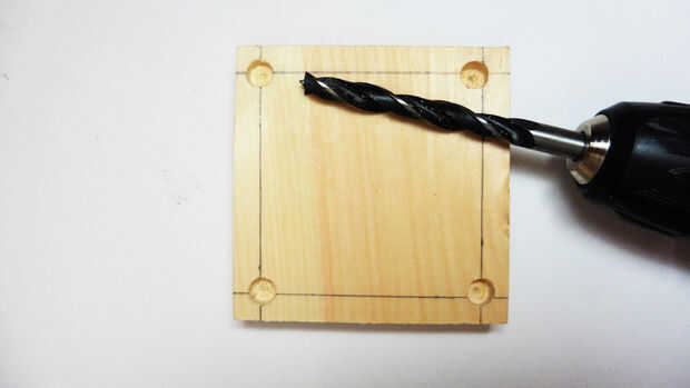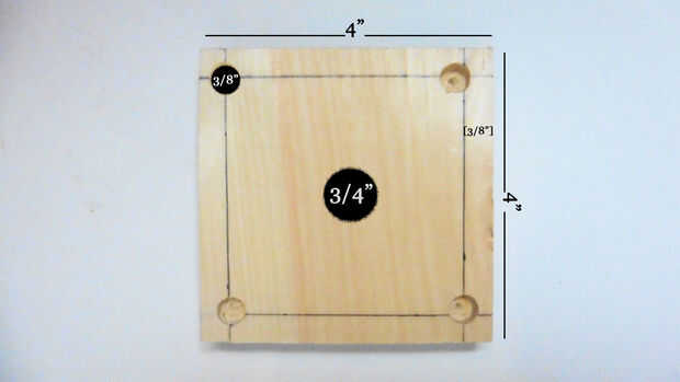 Consigue tus placas de madera. Con un lápiz, marcar un cuadrado cuyas aristas son 3/8" del borde de la madera (he intentado hacer los agujeros más cerca a los bordes y la madera que se terminó de partir, que las esquinas romper). Después de tener todo marcado, utilice un taladro para hacer agujeros en la esquina de la Plaza 3/8" de ancho y aproximadamente 1/3" de profundidad; Tenga cuidado de no perforar a través de todo el camino.