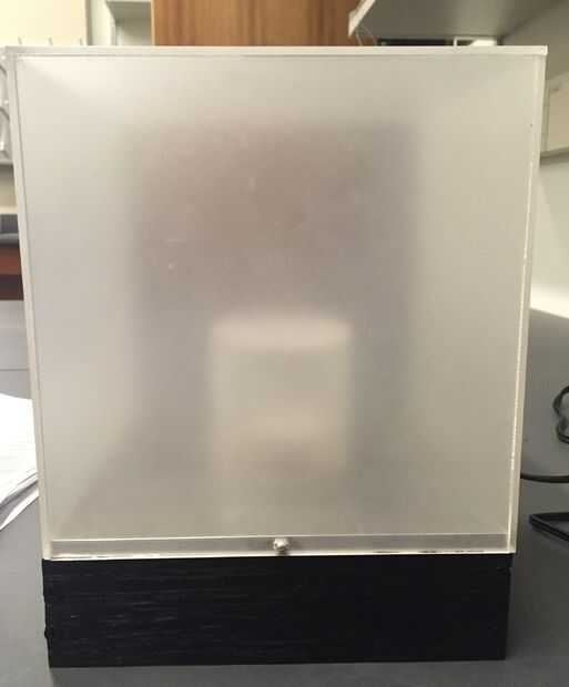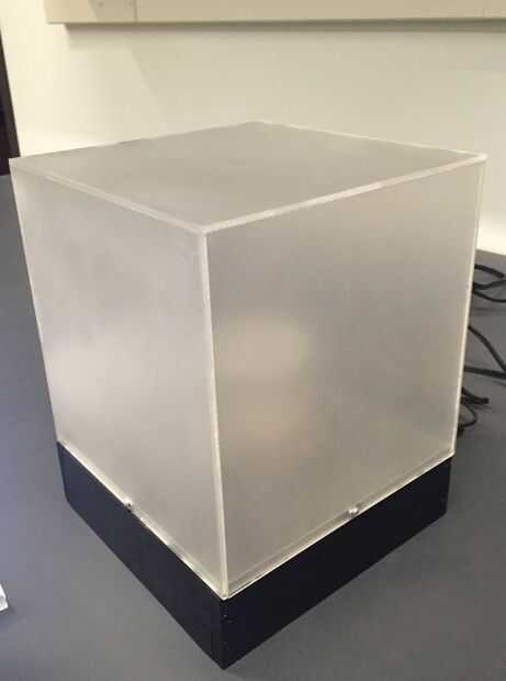 Esta lámpara consiste en un cubo de 8 pulgadas de acrílico esmerilado que se atornilla en una hoja de aluminio cuadrada. Este disipador térmico de aluminio casas de todos los componentes eléctricos y se une a una base de madera con goma de silicona. También hay acrílico difusor de luz dentro del cubo, como se puede ver en la imagen.