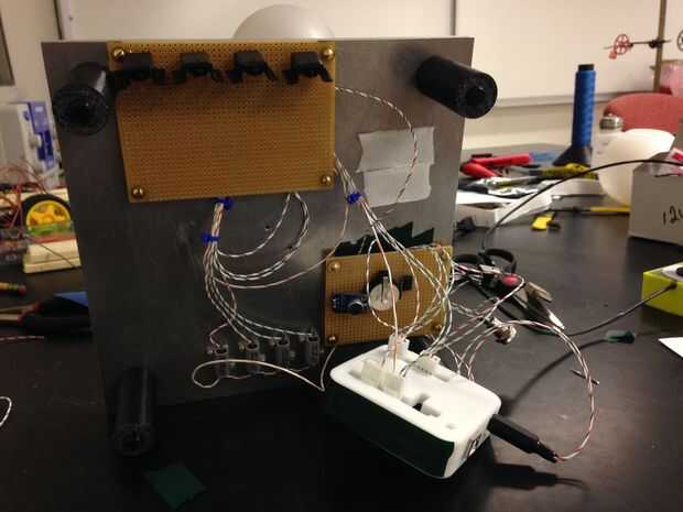 Nos cayó nuestro Arduino en un caso que 3D impreso y luego se retira los conectores temporales en favor de jefes, que hemos encajados en el Arduino. Luego dobla el caso de arduino en la parte inferior de la lámpara.