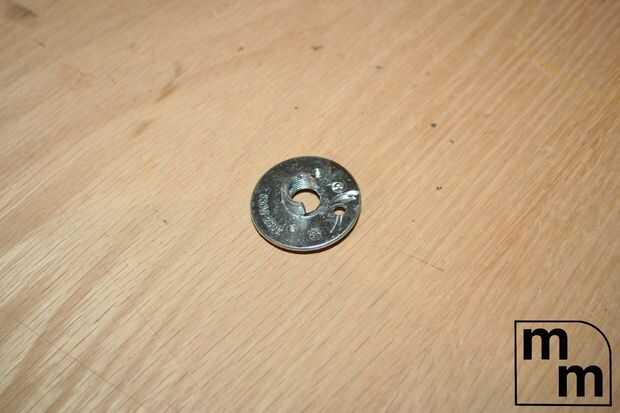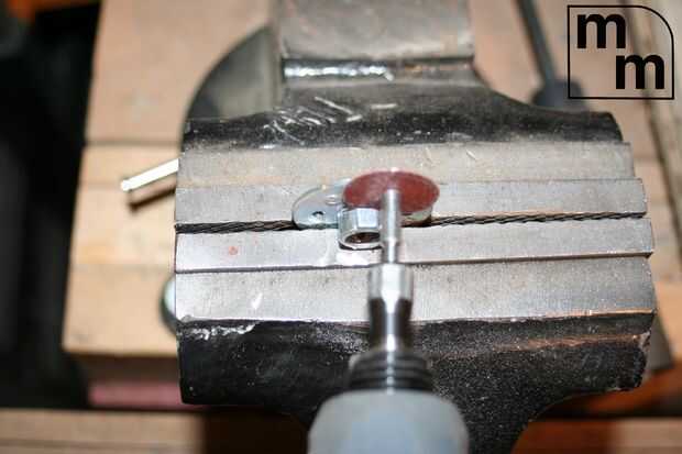 A continuación Sujete la pieza de metal con un par de alicates o vice y, utilizando una Dremel con disco de corte, corte a mitad del eje. Tenga cuidado de hacerlo bien para no dejar cualquier afiladas piezas irregulares de metal como usted no quiere cortar su cordón eléctrico en instrumentos afilados.