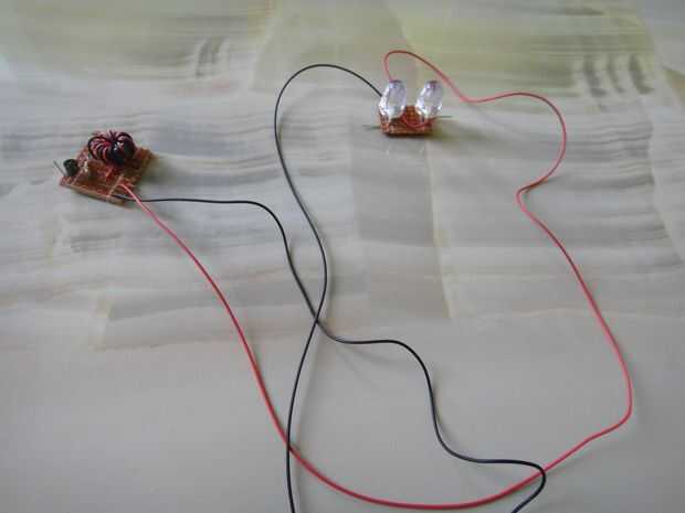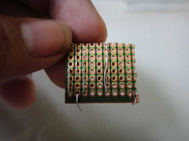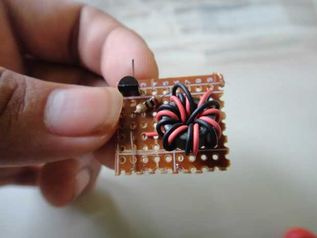 Así que en primer lugar tomar el pedazo más grande de las dos piezas de perf-Junta que se rompió. Ahora coloque el transistor, resistencia y los cables de 4 con el toroide en el perfboard. Doblar las puntas en direcciones opuestas para hacerlos permanecer en el lugar. Seguir el esquema o diagrama para hacerlo. También colocar LEDs en paralelo en el pedazo más pequeño de perfboard. Conecte la pieza con LEDs a la pieza con transistor a través de dos cables.