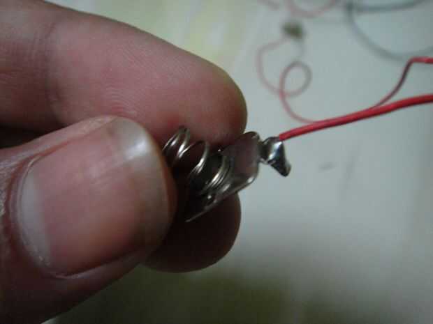 En primer lugar, tomar el palo de la embarcación y corte su extremo redondo. Envuelva algún papel alrededor de él y poner un cable dentro de la hoja para que el alambre puede conducir la electricidad a través de la lámina. Ahora tome el resorte y soldar un cable a él. Así que ahora usted tiene dos extremos de las baterías con dos cables. Un cable procedente de los palitos de papel y arte y el otro cable desde la primavera. Suelde el cable desde la primavera hasta un interruptor. Suelde el otro extremo del interruptor con un cable que va a la conexión de positivo de la batería de perfboard. Ahora soldar el cable que viene de la hoja a la conexión del negativo de la batería de perfboard.