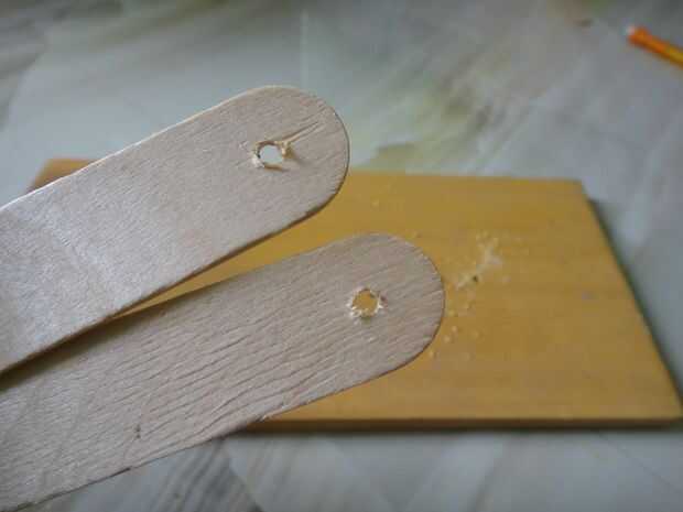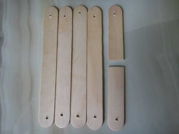 Ahora toma los palitos y usando un taladro de mano, haga agujeros a través de los puntos en los sticks de arte. Debe parecerse a los de la foto.