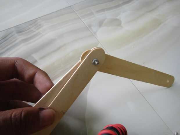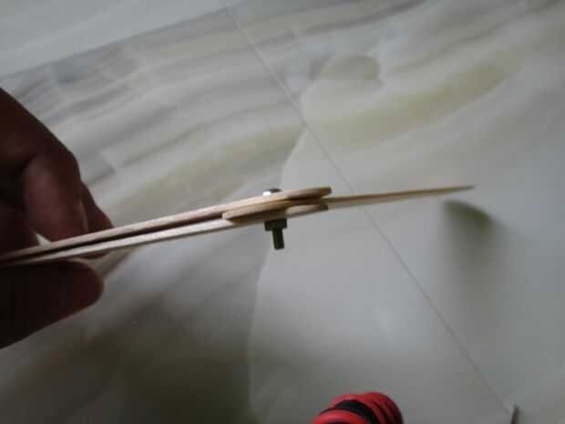 Ahora toma dos palitos y entre el final de los dos palitos, ponga el extremo del otro palillo de arte. Asegúrese de que los orificios estén alineados. Tome ahora el perno y el paso a través del orificio, y en el otro extremo apriete con la tuerca hexagonal. Debería ver algo como el de la imagen. Usted notará que puede mover los palillos libremente, si no puede mover los palillos, entonces tienes que aflojar la tuerca hexagonal, o si los palos se mueve demasiado libremente, tienes que apretar las tuercas.