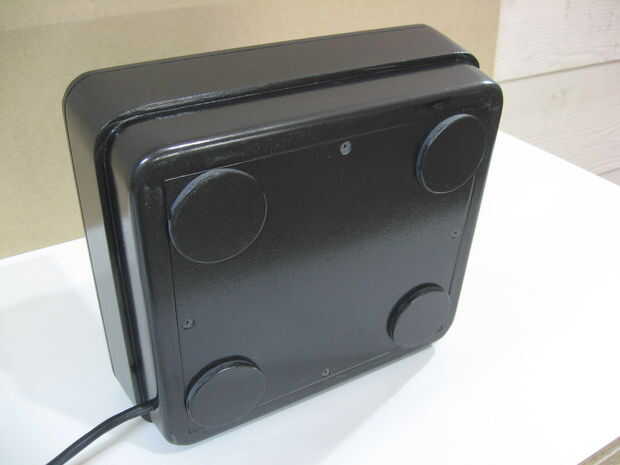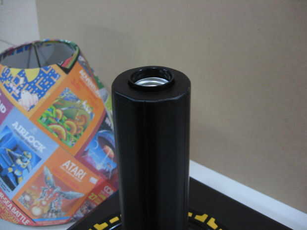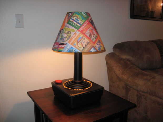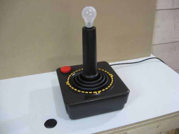 esta lámpara es un modelo bastante exacto de la escala del clásico joystick de Atari. Está hecho de fibra de densidad media (MDF) y está parada casi dos pies de altura. El botón rojo enciende y apaga la lámpara y la pantalla es un collage de impresiones de cubiertas juego clásico de Atari.