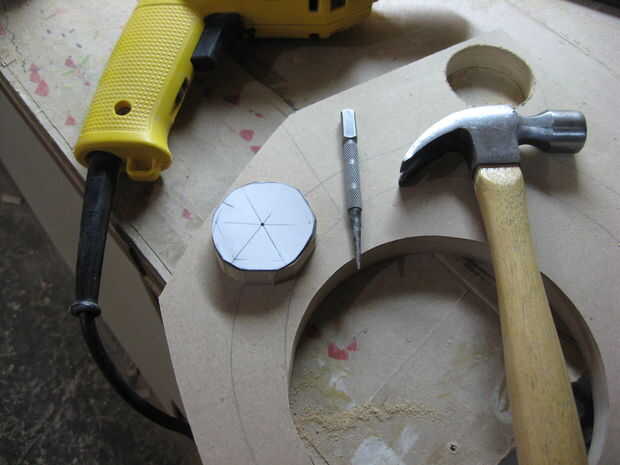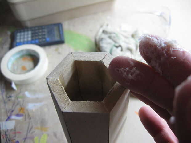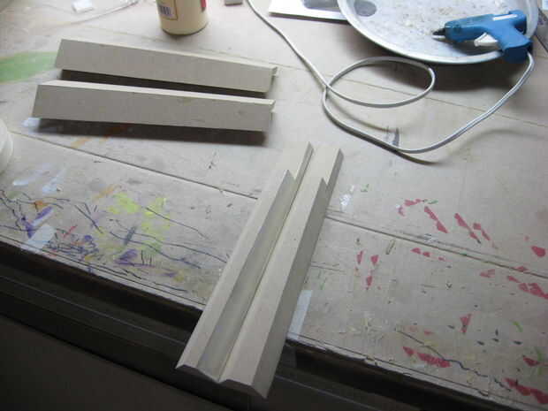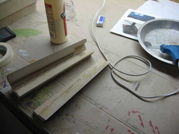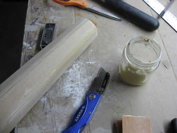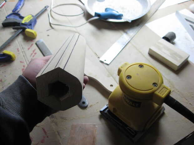 Las seis piezas diferentes para el palo estaban pegadas con pegamento de madera, utilizando una gota de pegamento caliente a lo largo de la articulación en lo que era ser el interior de la palanca. Esto tiene las piezas juntas mientras seca el pegamento de madera.