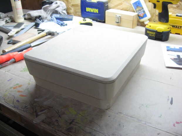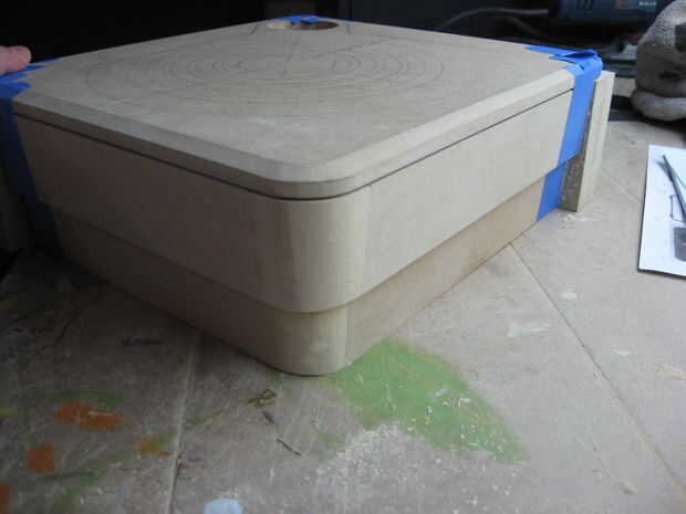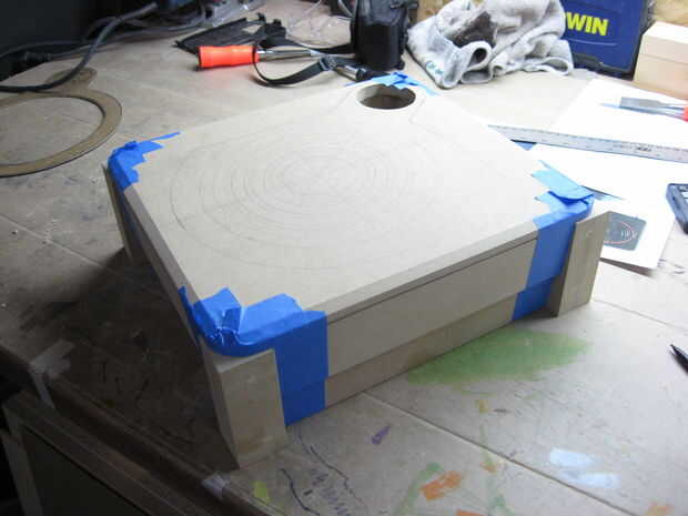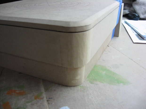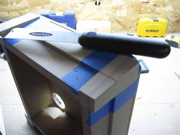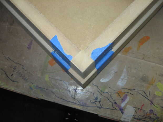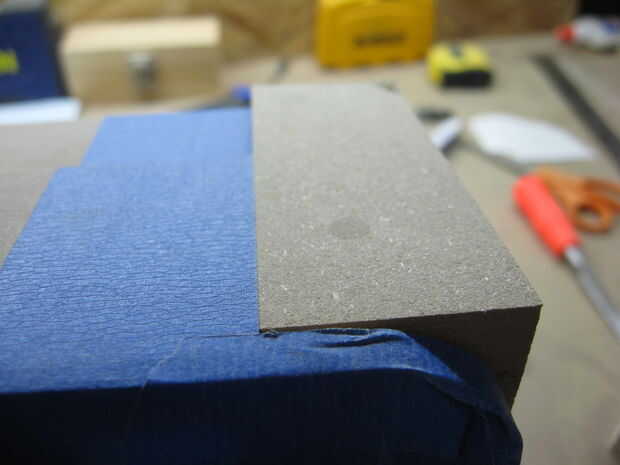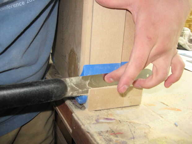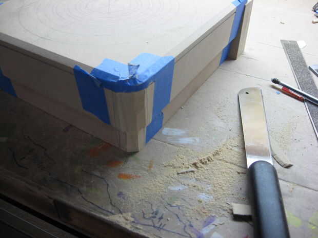 usé una sierra tirón, archivos y papel de lija a cada una de las esquinas de la forma. Cinta de enmascarar se colocó en los laterales junto a las piezas de esquina para evitar marcas de rascado de la sierra tirón.