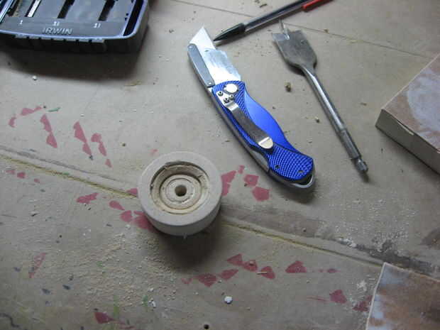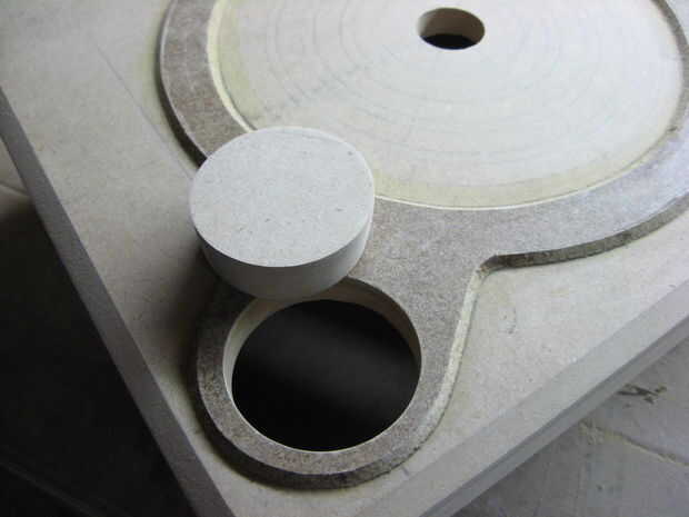 Conectado ese hueco con una nueva pieza de MDF y encolar el anillo levantado sobre la base. Esto hizo posible para hacer un corte limpio y al ras por el anillo y la parte superior de la base del botón.