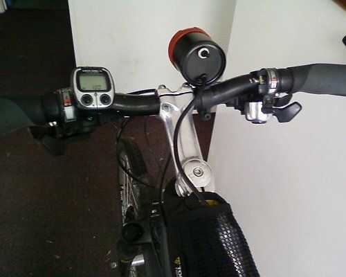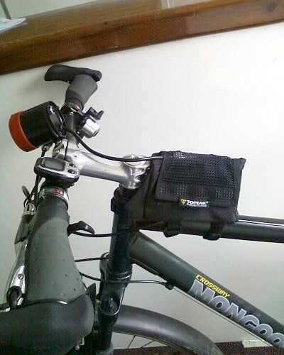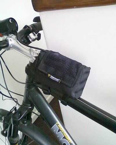 He encontrado viejo bolso (tela donante) y yo a coser a tipo de bolso/bolsa con correa de Velcro para unirla al tallo o manillar.